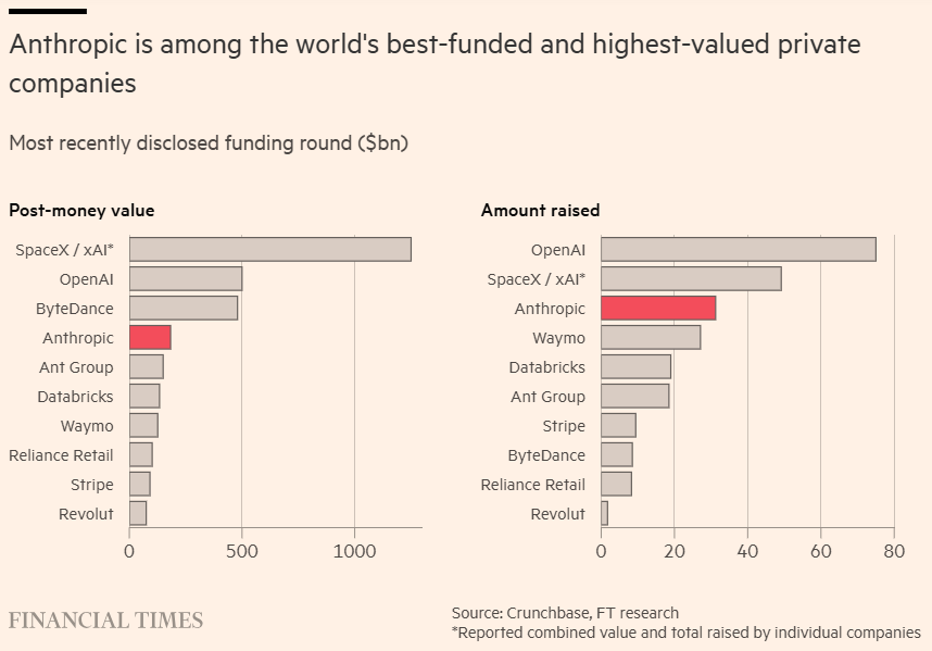 ○ That’s from a chart-heavy look at Anthropic, which was almost immediately stale after the hypey chatbot maker raised another $30bn on Thursday.