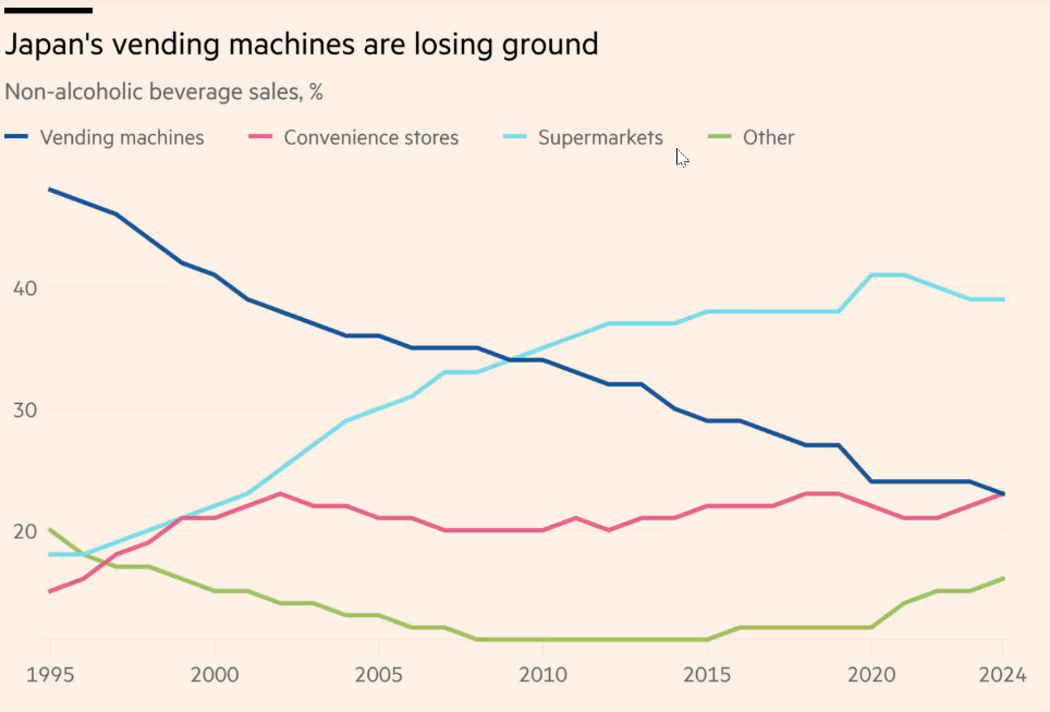 ○ Japan’s vending machines are leaving service and not being replaced (news of which we accidentally put in a chart quiz earlier this month, having misread the publishing schedule).
