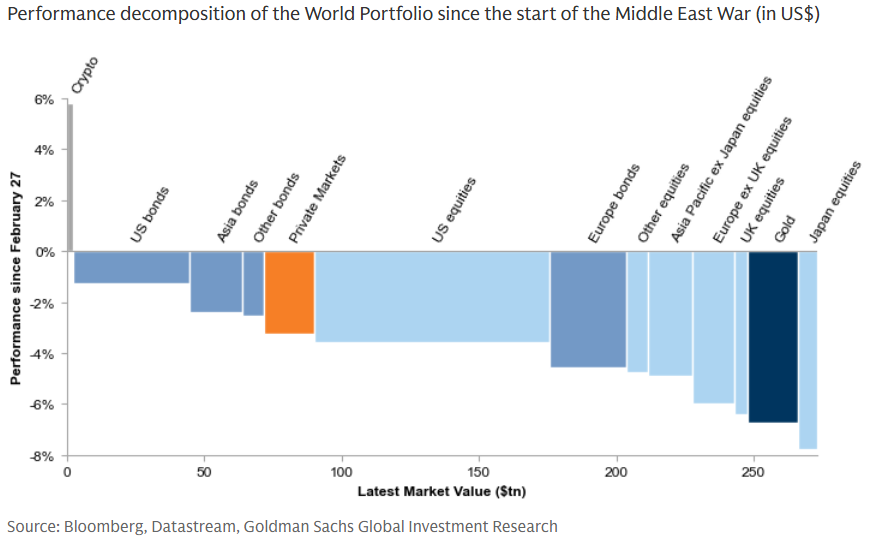 According to Goldman Sachs calculations, crypto is the only investable asset class to rise in value since the war started. Between then and Thursday morning, the value of global assets had fallen by $11tn.
