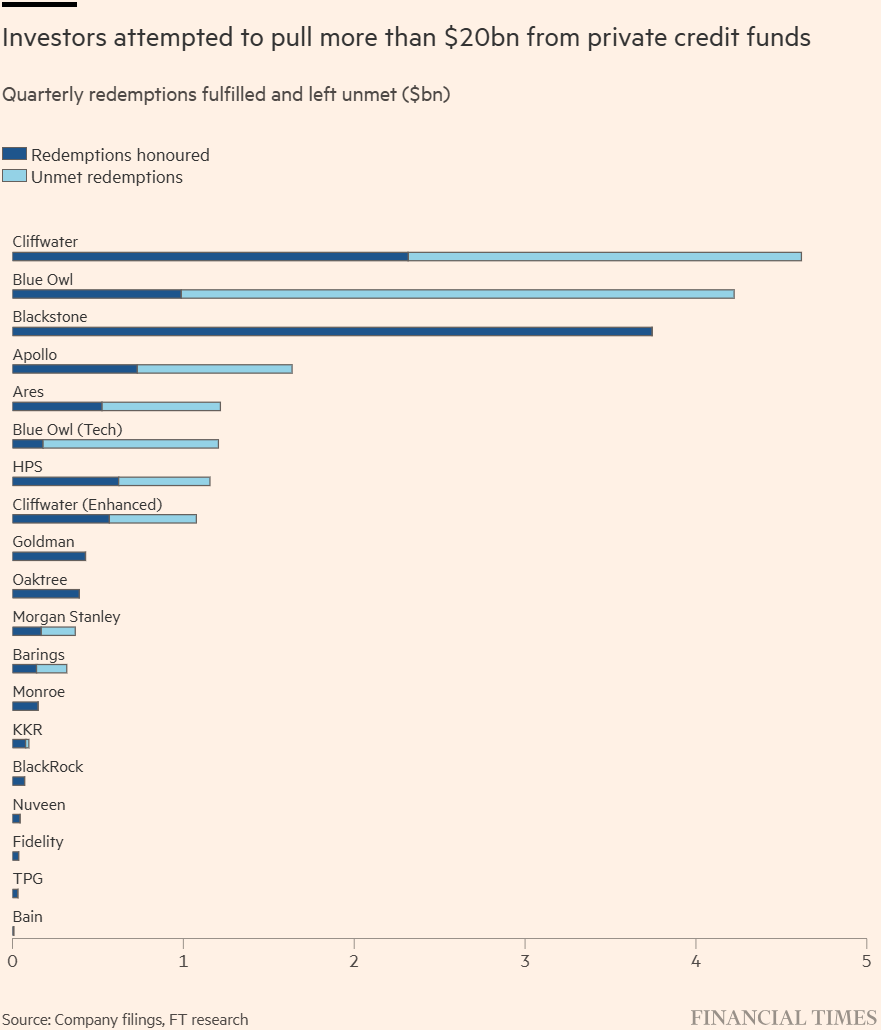 ○ Big private credit funds in aggregate honoured just over half of the first-quarter redemption requests they received.