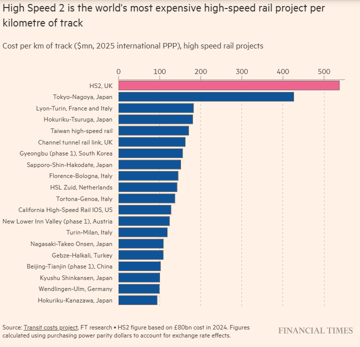○ HS2 is very expensive for various reasons, as outlined in this graphics-rich MainFT long read. Go to the comments for an argument.